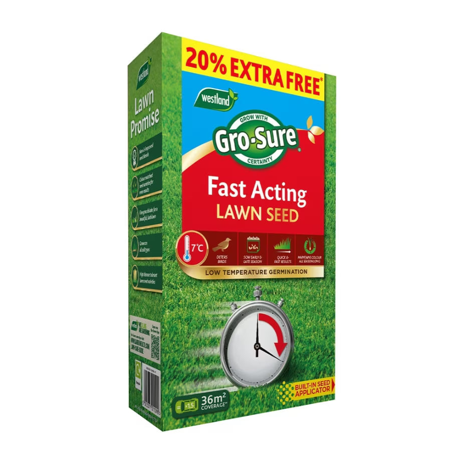 Gro-Sure Fast Acting Lawn Seed has an improved blend of quality, fast acting varieties specially crafted for a quick establishment. The seed includes bird deterrent dressing and varieties that geminate in colder conditions.